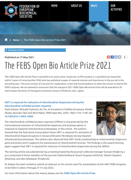 当教室の大学院生のKatiyar Arpit氏(現SGPGIMS, Lucknow,インド)が、記念すべき第1回目のThe 2021 FEBS Open Bio Prizeを受賞しました。本賞は、欧州生化学連合FEBSが発行する科学雑誌FEBS Open Bioへ顕著な論文を発表したPhD学生あるいはPhD取得後5年以内の若手研究者の中から毎年1名に授与されるものです。今回発表した論文「HSF1 is required for induction of mitochondrial chaperones during the mitochondrial unfolded protein response, FEBS Open Bio (2020) 」は、山口大学大学院医学系研究科医化学講座の大学院生として在学中に発表したものです。Katiyar氏は、2022年にリスボン(ポルトガル)で開催される第46回FEBS Congressで招待講演を行います。