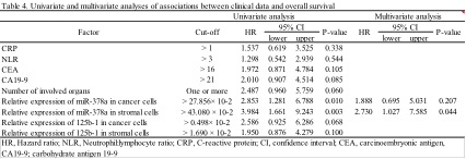 表:多変量解析の結果、様々な予後因子の中で、癌間質のmiR-378a量が最も免疫化学療法の効果を予測する因子であることが分かった。
