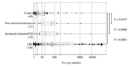 図1:大腸腫瘍(腺腫、大腸癌)、健常者の便検体におけるフソバクテリウムヌクレアタムの検討. 健常者と比較し、有意に増加している。
