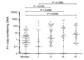 図2:大腸癌切除後の癌以外の正常粘膜(Mucosa)と癌部(ステージI, II, III, IV)におけるフソバクテリウムヌクレアタムの検討. 進行がんに進展するほど、量が多くなる。