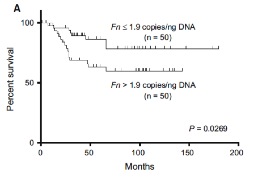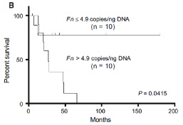 図3: A 大腸癌100例において、癌部のフソバクテリウムの量の差で予後が異なる。