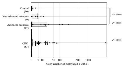 大腸腫瘍患者の便検体においてTWIST1メチル化が有意に増加している(臨床検査・腫瘍学、消化器内科学、消化器・腫瘍外科)