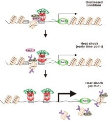 哺乳動物細胞では、少量のHSF1はRPAと複合体を形成することであらかじめヌクレオソーム構造をとるDNAに結合し、それがストレス時の顕著なHSF1結合を導くことが知られています(Fujimoto et al, Mol. Cell 2012)。本研究によって、HSF1が急激にDNAへ結合するための新たな準備機構が明らかとなりました。