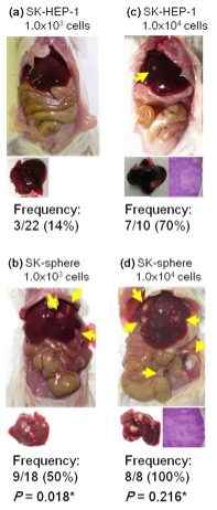 肝癌由来細胞株であるSK-HEP-1を用いて通常の培地で培養した細胞とNSF-1などを含むsphere誘導培地を用いて得た癌幹細胞様細胞を超免疫不全マウスの脾臓に注射し、肝転移の形成を比較した。またflow cytometryやRT-PCRによってEMTマーカーやEMT関連mRNAの発現を調べた。さらに、次世代シークエンサーを用いて網羅的な解析を行った。