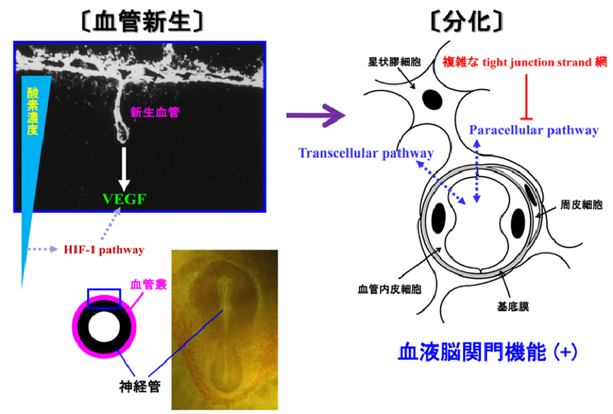 成体の脳血管系は、脳組織特異的な分化を示す血管内皮細胞を有しており、血液と脳組織の間にバリアーを形成し神経細胞が正常に機能するための微小環境を維持している。こうしたバリアー機能を有する血管系は、個体発生過程において、血管周囲組織の酸素濃度変化に反応した増殖・分化過程を経て形成される(図1)。一度形成させた成熟脳血管系にも、周囲酸素濃度の変化に敏感に反応した改築(血管バリアー機能の破綻、血管新生など)が惹起され、糖尿病網膜症や虚血性脳疾患など多くの疾患の病態悪化の要因となる(図2)。本研究計画では、低酸素刺激に対する成熟脳血管系の反応機構について詳細な解析を行い、種々の難治性疾患の病態解明、さらには新たな治療法開発を目指す。