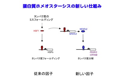 研究グループは、HSF1によって作動するヒトの因子を探索し、そのうちタンパク質のフォールディングの異常を強く抑制する調節因子NFATを発見した。神経変性疾患の中でも代表的なポリグルタミン病のモデルマウスで、NFATを欠損すると、HSF1欠損と同様に、ポリグルタミンタンパク質がフォールディングの異常により速やかに神経細胞に蓄積し、神経症状が現れ、早期に死に至ることが判明した。さらに、NFATは異常なタンパク質の分解を助けるPDZK3とCRYABを誘導することでタンパク質ホメオスタシスを保つことが明らかになった。