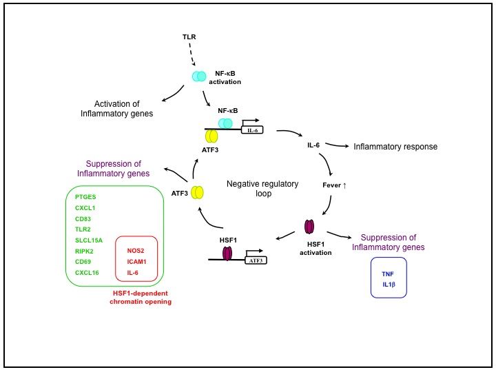 すべての生物は、その生存温度より数度の温度上昇を感知して一群の熱ショック蛋白質を誘導して対応するシステムを備えている。この応答は熱ショック応答と呼ばれ、熱ショック転写因子HSF1によって主に転写のレベルで制御される。HSF1は個体発生の過程での重要な役割を担っている。我々は、以前の研究から、HSF1が免疫応答、特にT細胞依存性のIgG産生に関与していることを見いだしていた(Inouye et al. J.Biol. Chem. 2004)。熱ショック蛋白質群の発現制御とともに、一部はIL-6遺伝子の発現制御を介していた(Inouye et al. J. Biol. Chem. 2007)。炎症反応と熱ショック応答との接点をさらに追求するため、HSF1によるIL-6発現制御の生理的意義とその分子機構の解明を進めてきた。驚いたことに、この経路は発熱•炎症応答のフィードバック制御に重要な役割を担っていることを見いだした。本研究により、発熱により活性化されるHSF1が炎症性サイトカインの発現の多くを抑制すること、その抑制機構には上流配列に直接結合するだけでなく、多くの遺伝子群でATF3を介していることが分かった。また、HSF1は多くの炎症性サイトカイン遺伝子の上流に結合して、クロマチンを開いた状態に保つことで発現制御を助けていた。これらの結果は、熱ショック応答が炎症反応の制御に密接に関わっていることを示唆している。