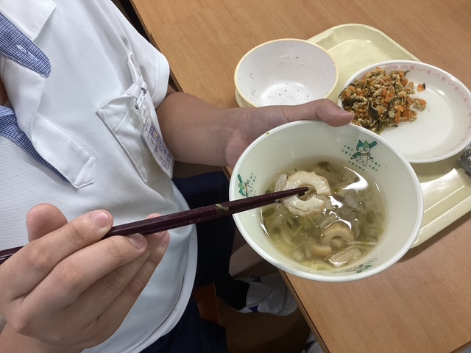 ~白ごはん(ひじきふりかけ) 目にA(エー)炒め ランドルト環スープ 牛乳 ~