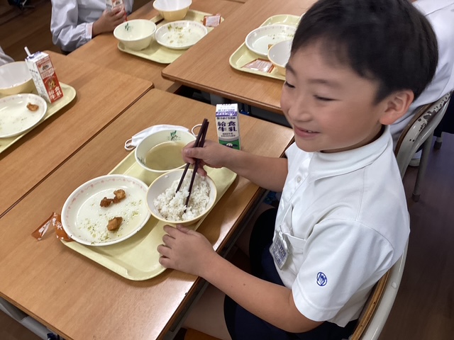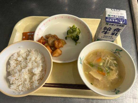 ~麦ごはん チキンいもごぼう ブロッコリーの煮びたし きのこのみそ汁 牛乳~