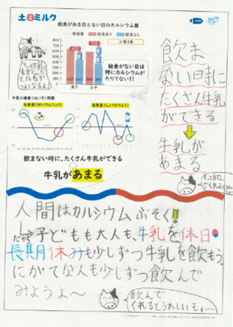 4年生の食育授業として「土日ミルク」のポスターづくりを行いました。「土日ミルク」とは、子どもたちのカルシウム不足の解決を目的に、学校給食がない日も牛乳を飲むことを促進する取組のことです。