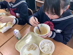 スープの中には、小さなアルファベットの形をしたマカロニが無数に入っています。実はこのメニュー、本校だけでなく他校でも人気の給食メニューの一つと言われています。