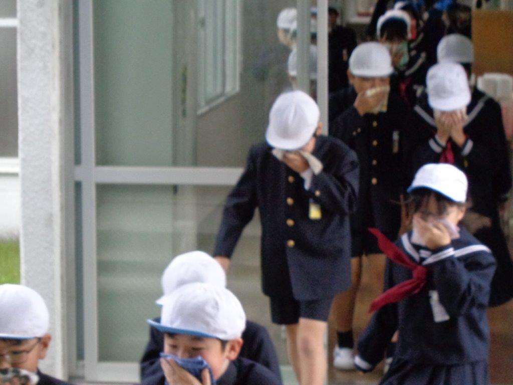 地震の音とともに緊急放送が流れると,子どもたちは静かに机の下に入り,頭を守る姿勢をとりました。その後,地震に続けて火災報知器の音が鳴ると,落ち着いて次の指示を待ち,体育館へ速やかに避難することができました。