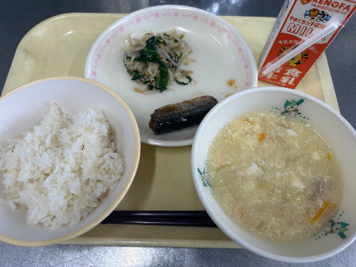 ~麦ごはん さんまの甘露煮 ほうれんそうのごまあえ ふわふわ汁 牛乳~